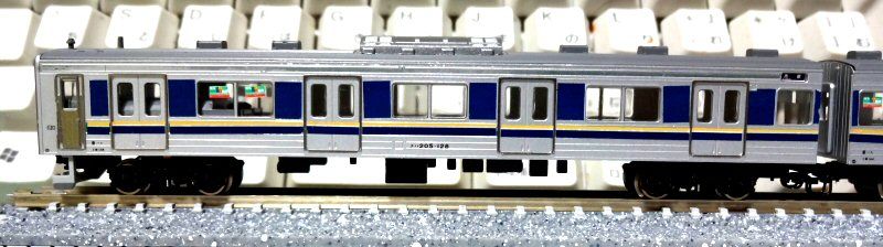 205系は通常のカラーリングでは窓下に帯が入る他に、窓上にも細い帯が入ります。